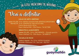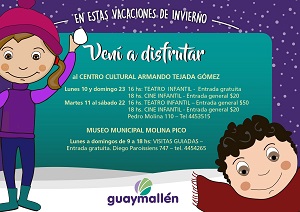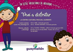 Cultura Junio 30, 2017La Municipalidad de Guaymallén desarrolló una amplia oferta de espectáculos para los chicos en sus vacaciones. Las mismas se llevarán a cabo desde el lunes 10 al domingo 23, en el Centro Cultural Pascual Lauriente (Bandera de Los Andes 8956, Rodeo de la Cruz) y en el Centro Cultural Armando Tejada Gómez (Pedro Molina 110).