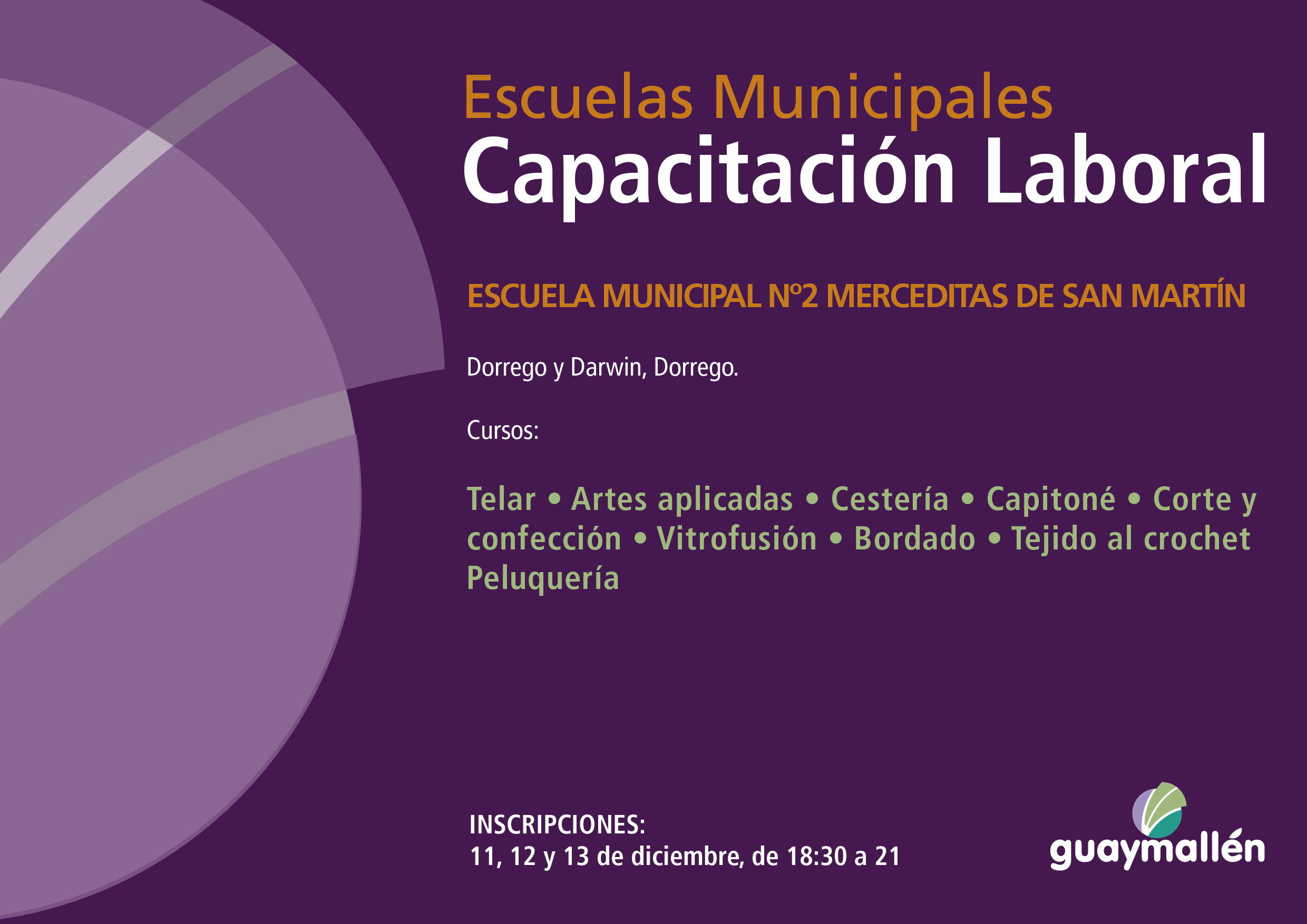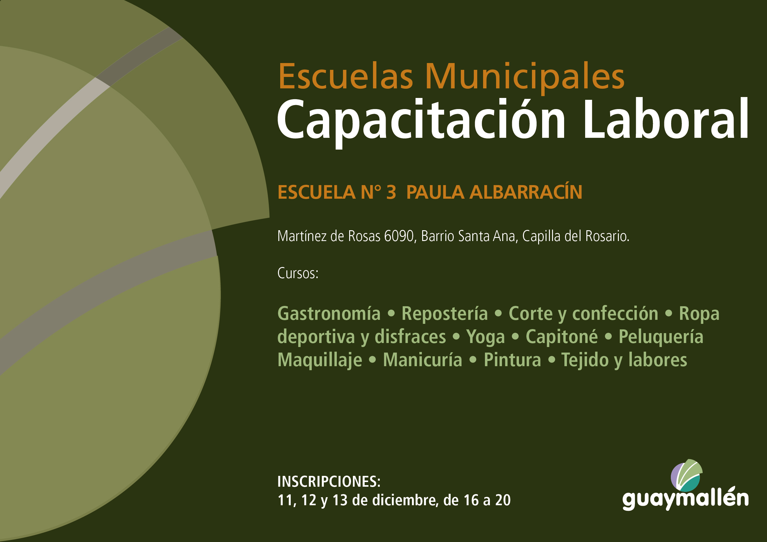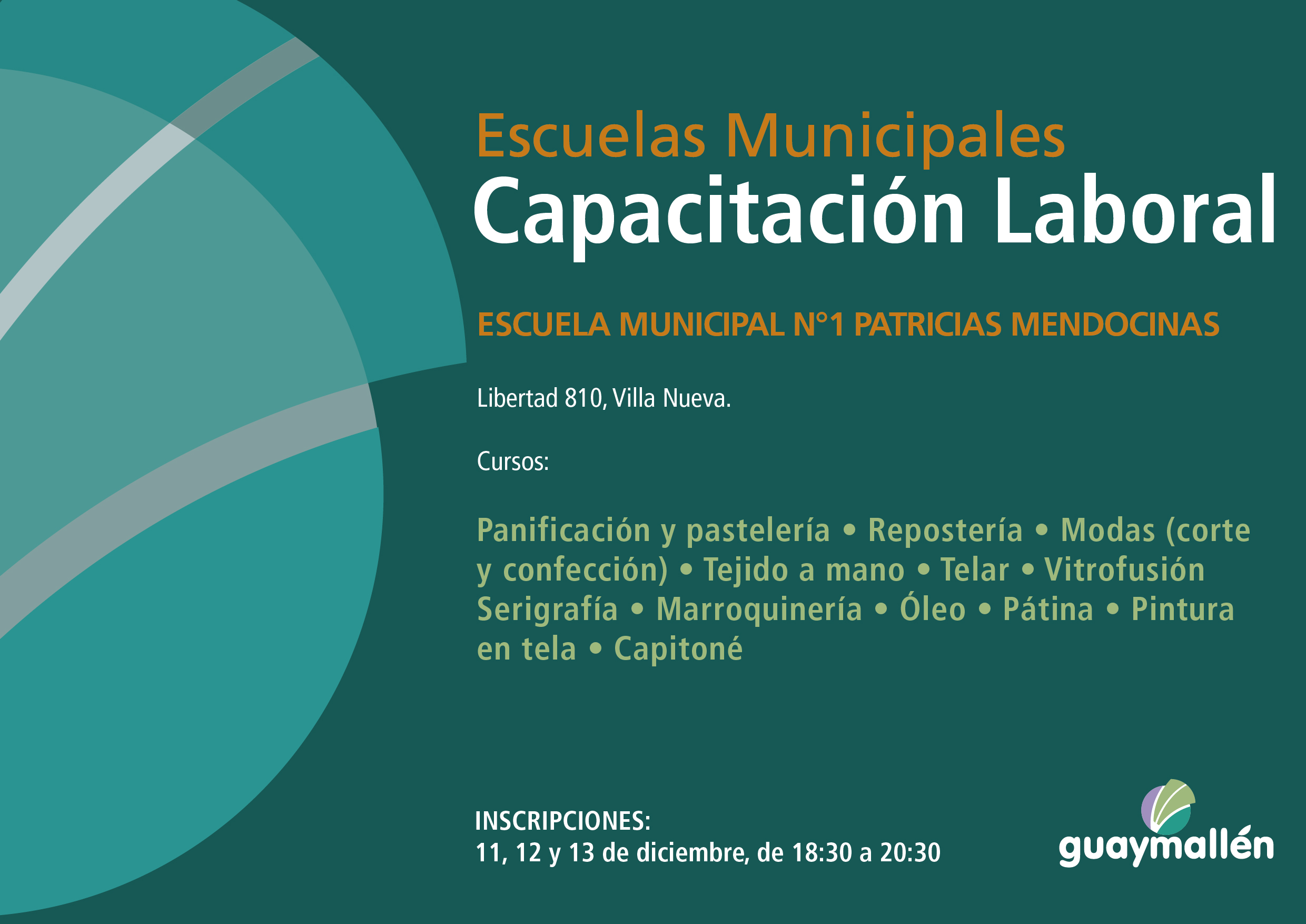 Otras Diciembre 5, 2017La Municipalidad de Guaymallén informa que, los días lunes 11, martes 12 y miércoles 13 de diciembre, se realizarán las inscripciones para participar de los diferentes cursos de oficios, que se imparten en las escuelas comunales.